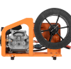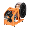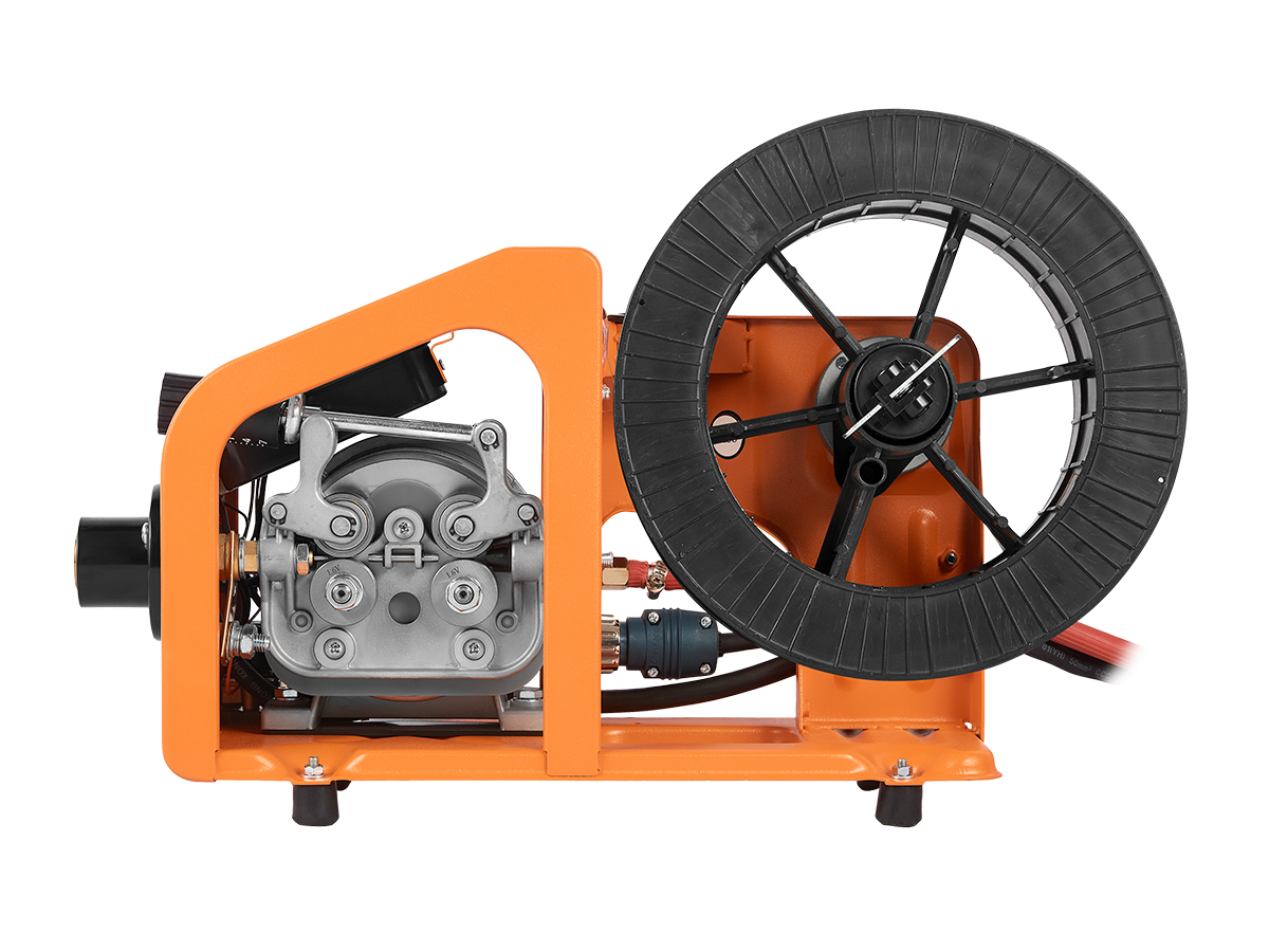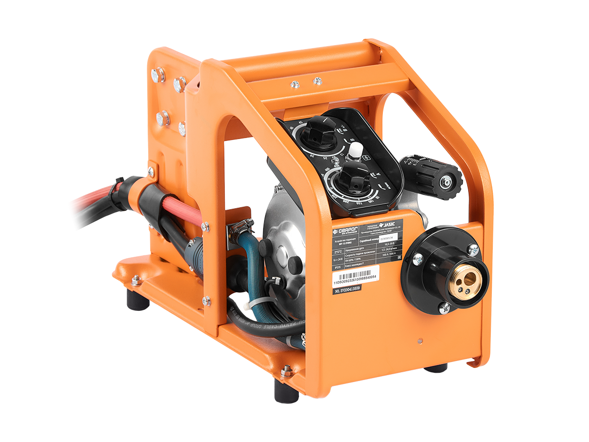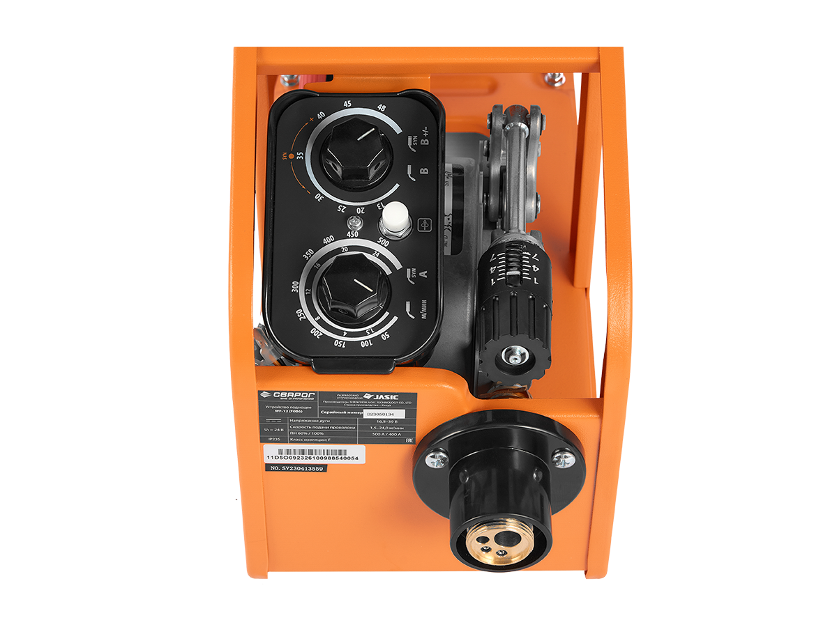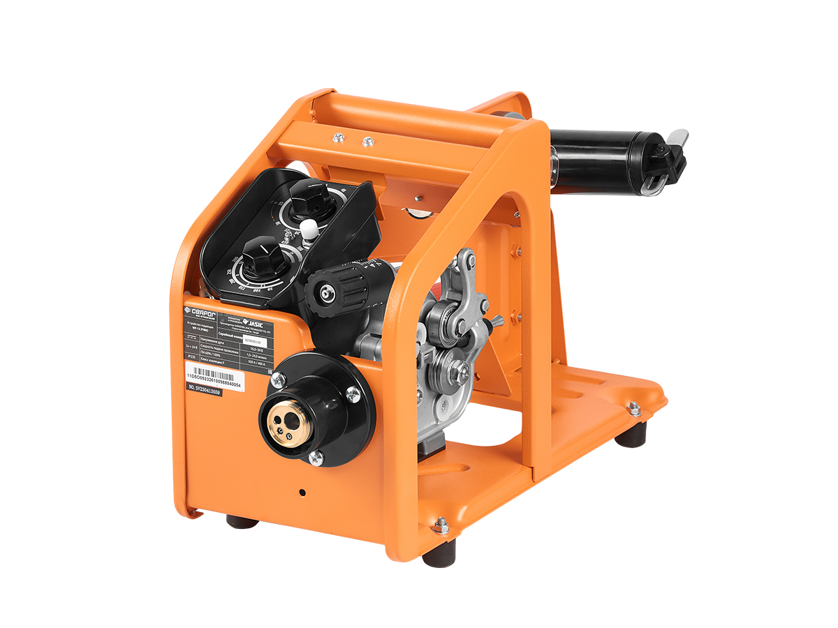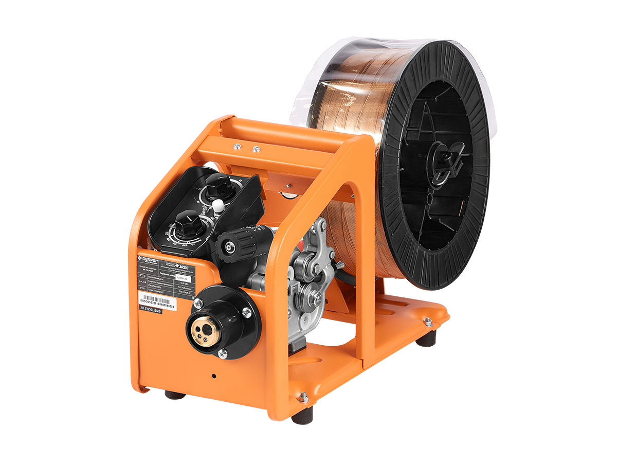 Промышленный подающий механизм обеспечивает идеальную подачу проволоки, включая порошковую и мягкую алюминиевую. Конструкция рассчитана на катушки весом до 20 кг, а усилие подачи достаточно для работы на больших вылетах горелки.