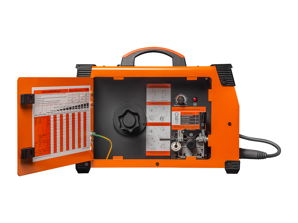 Аппарат предназначен для полуавтоматической сварки как в среде защитных газов (MIG/MAG), так и с использованием самозащитной порошковой проволоки (FCAW), что позволяет работать без газового баллона . Встроенный двухроликовый механизм обеспечивает плавную подачу проволоки со скоростью от 1.5 до 14 м/мин .
